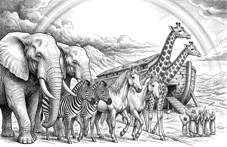 • Breathtaking Biblical Art: Color your way through sweeping, panoramic scenes—from the majestic procession of animals boarding Noah’s Ark to the quiet, guiding light of the Psalms and powerful moments of spiritual victory.