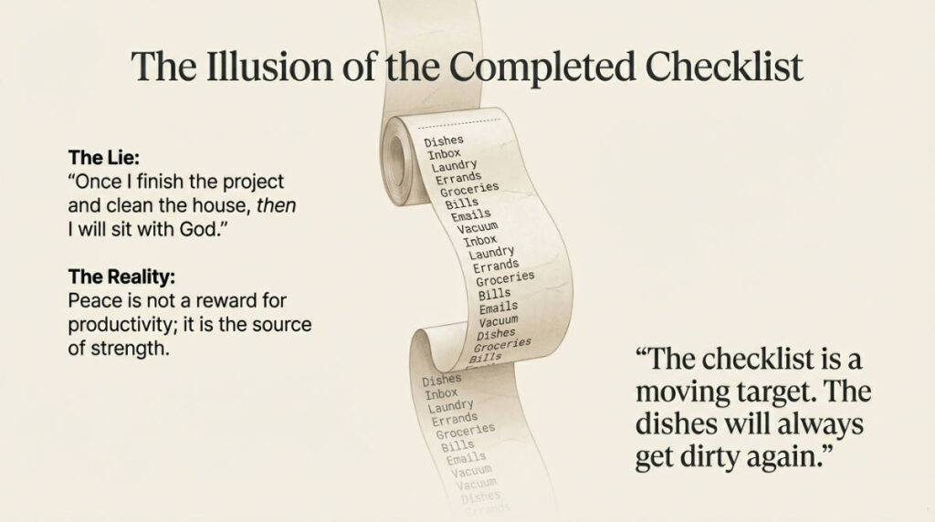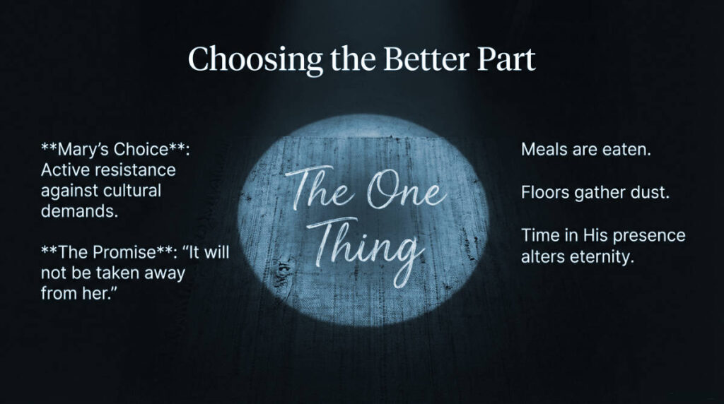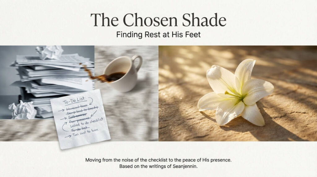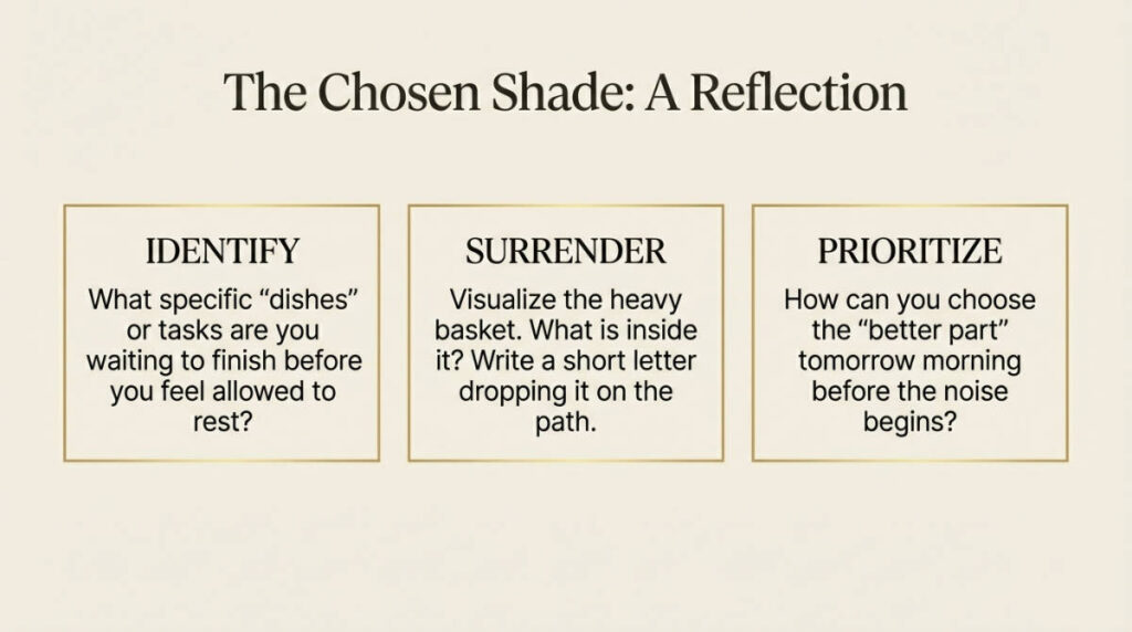 When spending time with Jesus becomes your greatest reward, the endless tasks lose their power to command your stress. The chores will still be there, and the dishes will eventually get washed, but they will no longer dictate your peace. You will have learned the greatest secret of a surrendered life: the ultimate joy isn’t found in an empty sink, but in a full heart, resting securely in the chosen shade at the feet of the Savior.