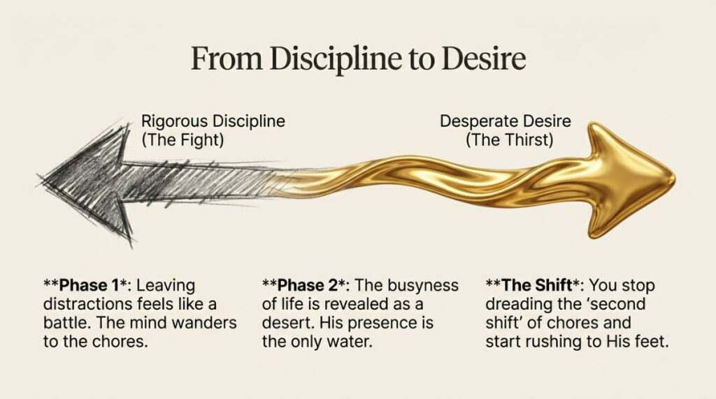 When we first begin to leave our distractions behind, choosing to sit quietly with the Lord can feel like a rigorous discipline. Our minds wander, and the pull of the unfinished chores tugs at our attention. But as we continue to choose the “better part”—opening the Word, bowing in prayer, and meditating on His goodness—a profound shift takes place within us. The discipline turns into a desperate, beautiful desire. We begin to resonate deeply with the cry of Psalm 63:1 “O God, you are my God; I earnestly search for you. My soul thirsts for you; my whole body longs for you in this parched and weary land where there is no water.” We finally realize that the endless busyness of life is a desert, and only His presence can quench our thirst.
